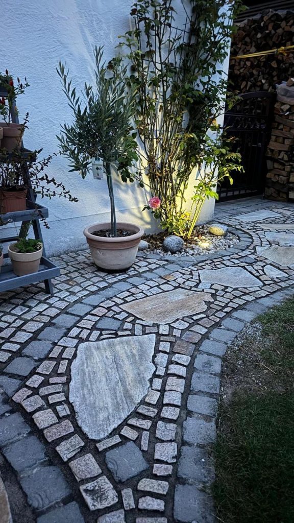 Gestaltung von Terrasse und Gartenwegen mit Naturpflastersteinen. die stilvoll aussehen sowie robust und langlebig Sind.